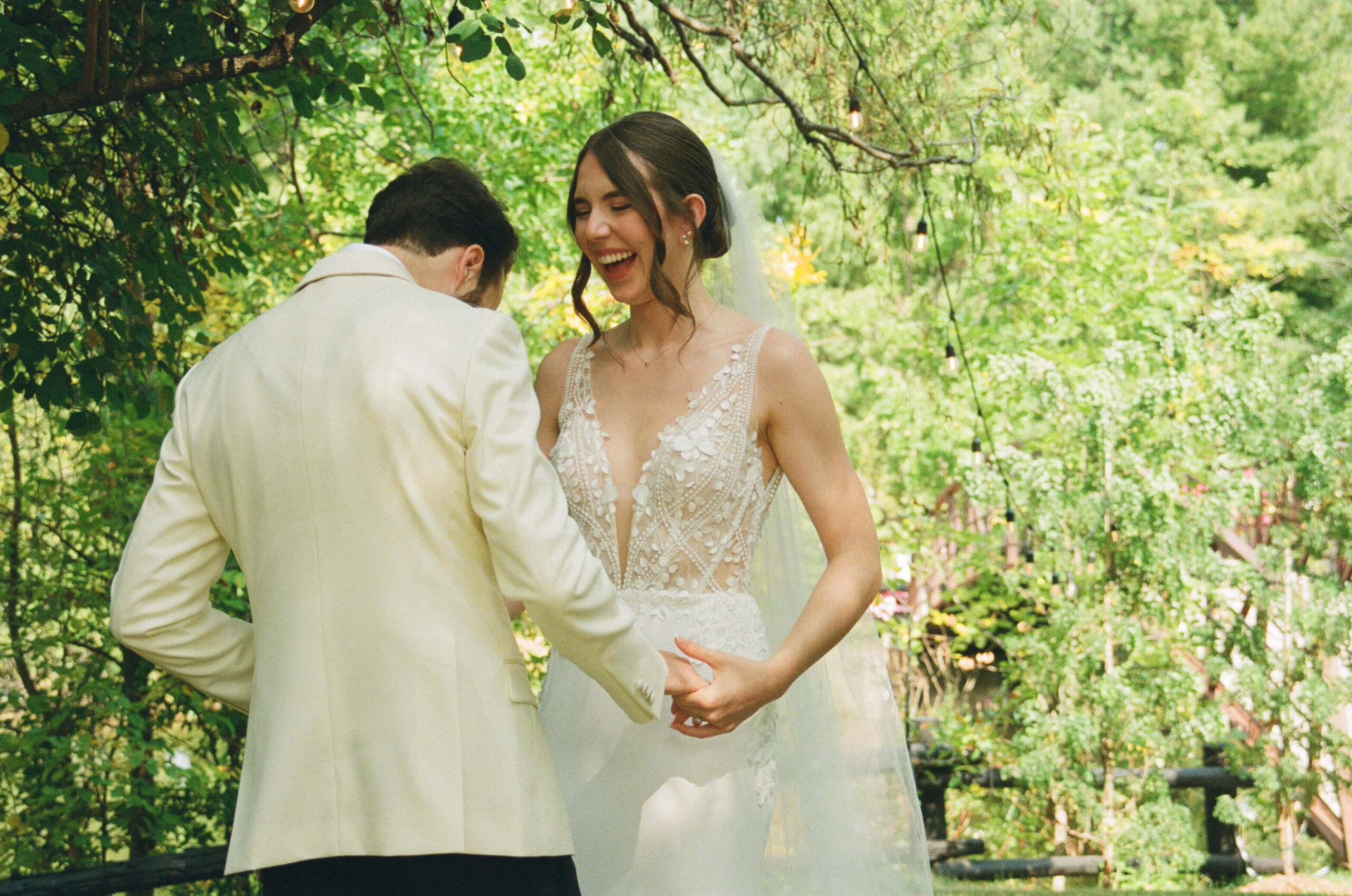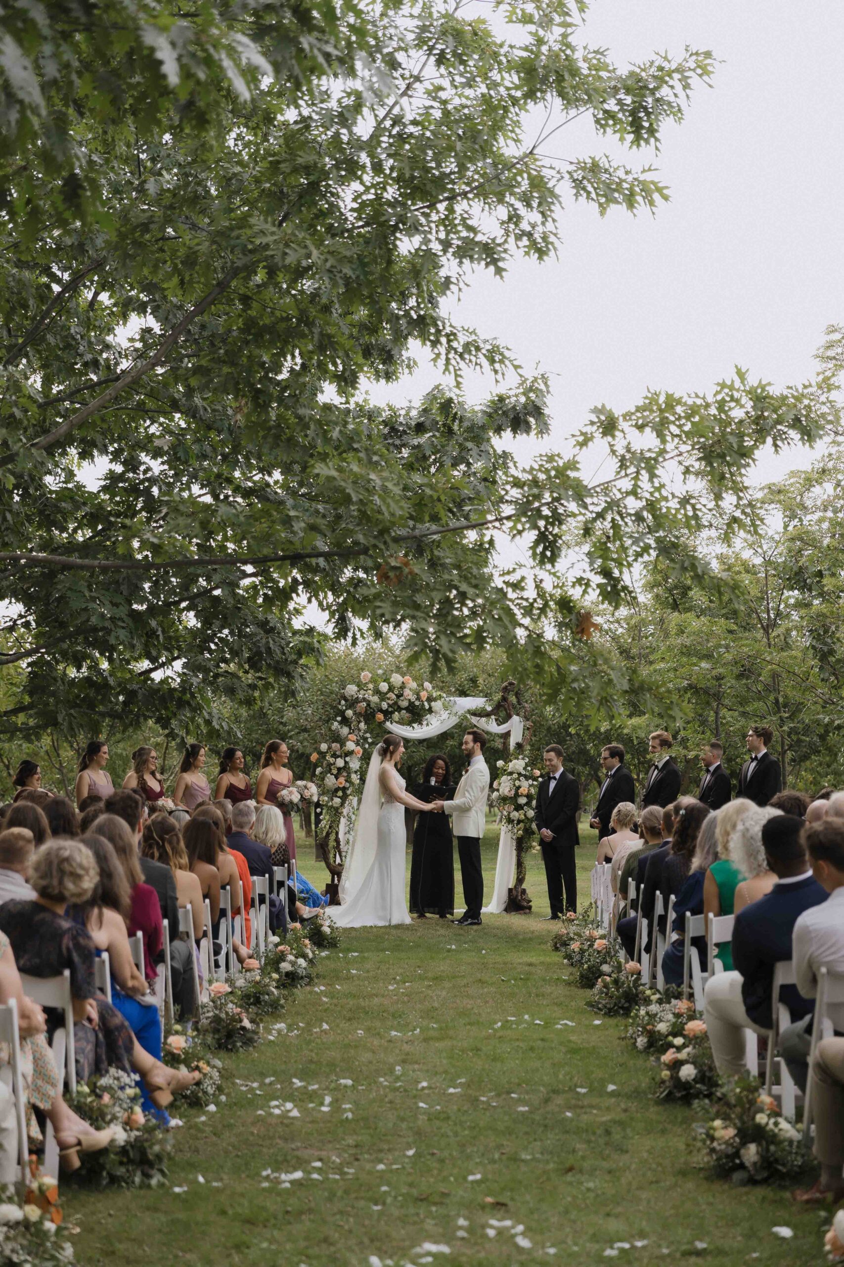 The couple shared a few emotional moments when they saw each other before the vows. We made sure to capture some stunning film photos with the beautiful backdrop of the Kurtz Orchards. The string lights and florals added a nice touch to the day, making everything feel perfectly romantic and laid back.