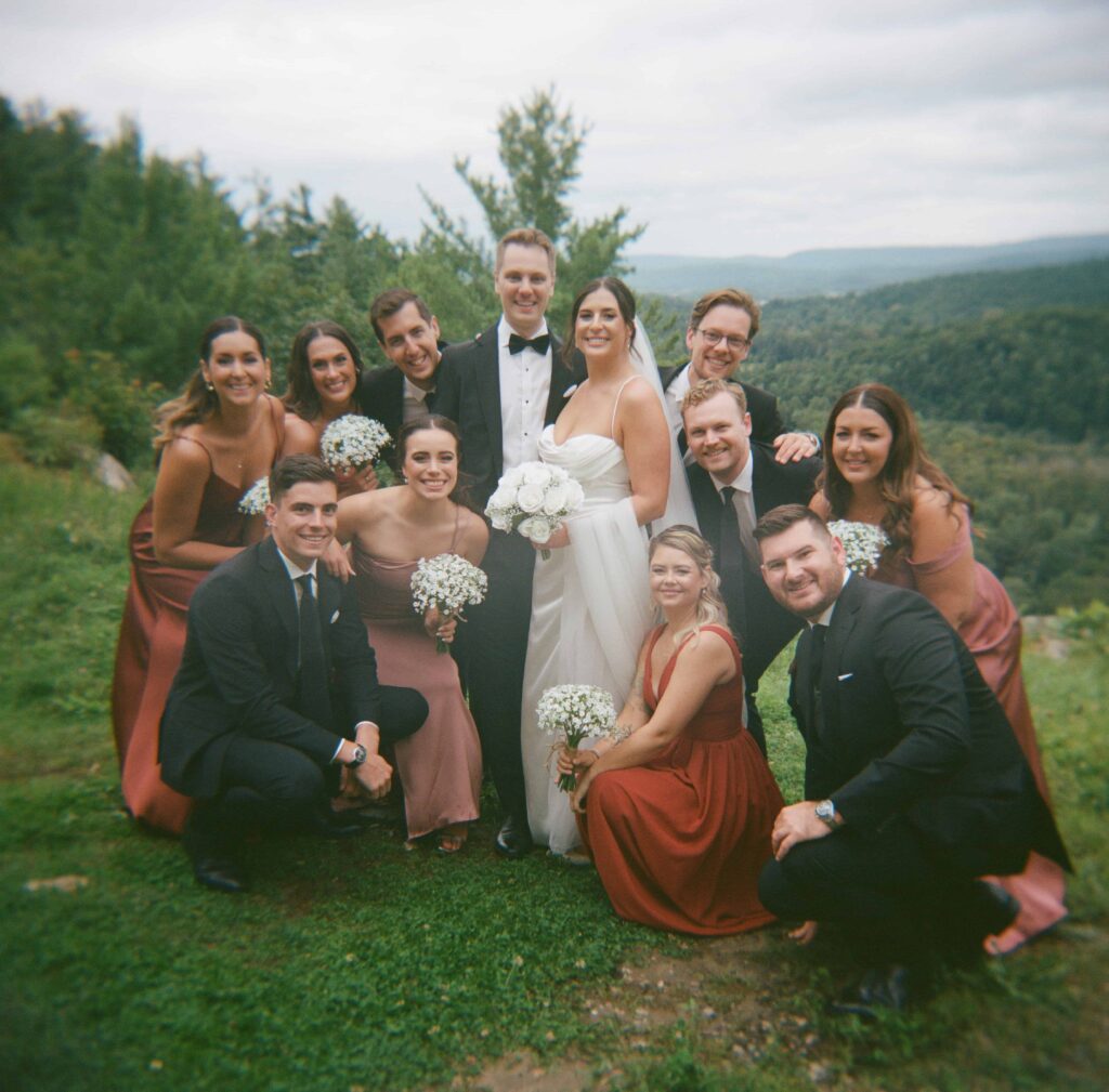 Le Belvédère’s staff truly prioritize the guest experience and it shows — especially during cocktail hour. With an outdoor cocktail deck, seating and a campfire, plus space for both indoor and outdoor bars, guests can relax and enjoy the celebration in any weather. The spacious terrace beside the ceremony space — a perfect spot for guests to mingle and for me to capture photos together (including large group shots with that view as the backdrop). And when it comes to the ceremony, even if the weather turns, the venue has it covered: guests are provided with umbrellas, and the couple stays dry under a canopy at the end of the aisle. But if it’s too wet to stay outside, they have an indoor option in the basement that has floor to ceiling windows looking out to the same view. These thoughtful touches make the entire day feel seamless and stress-free for everyone and they absolutely help you get the best candid photos when your final gallery arrives.