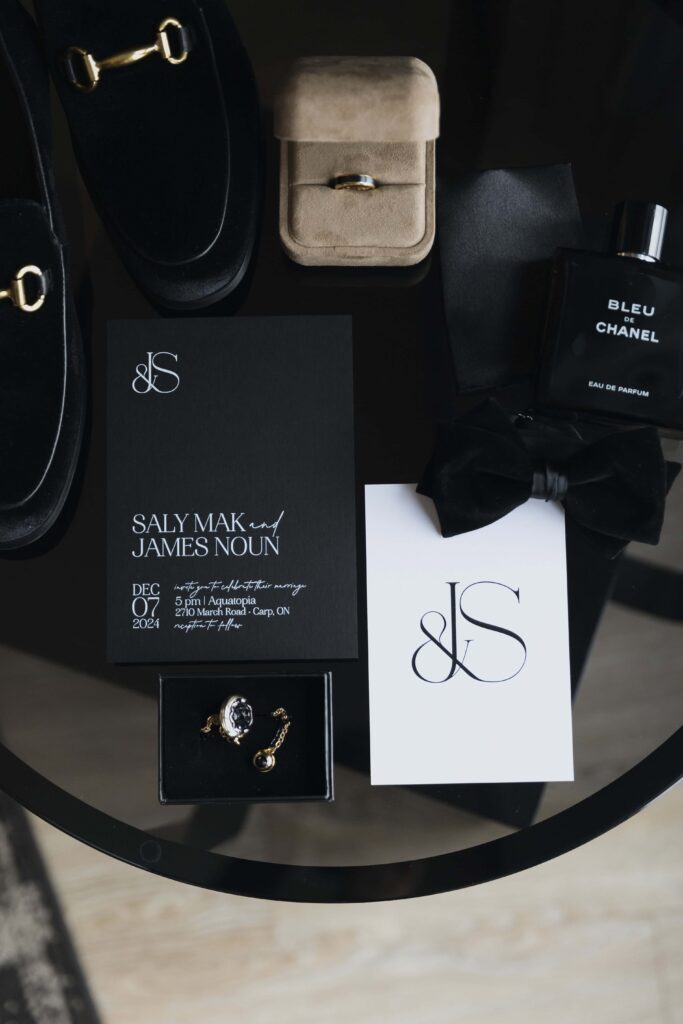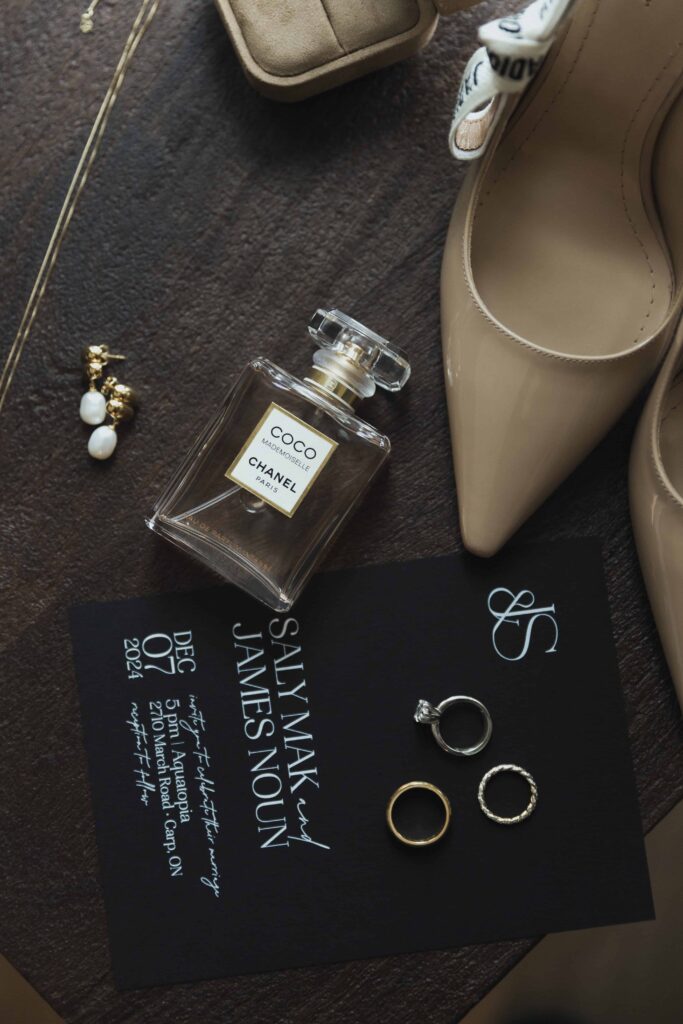This was a New Year’s Eve wedding, so the bride brought in disco balls to match the vibe and added them throughout Venue Twenty Two. She chose clean, romantic fonts for the invitations and save-the-dates, keeping things simple but elegant. When it comes to flat lays, you don’t need a ton of items. You can choose a few meaningful pieces you’ll want to remember.